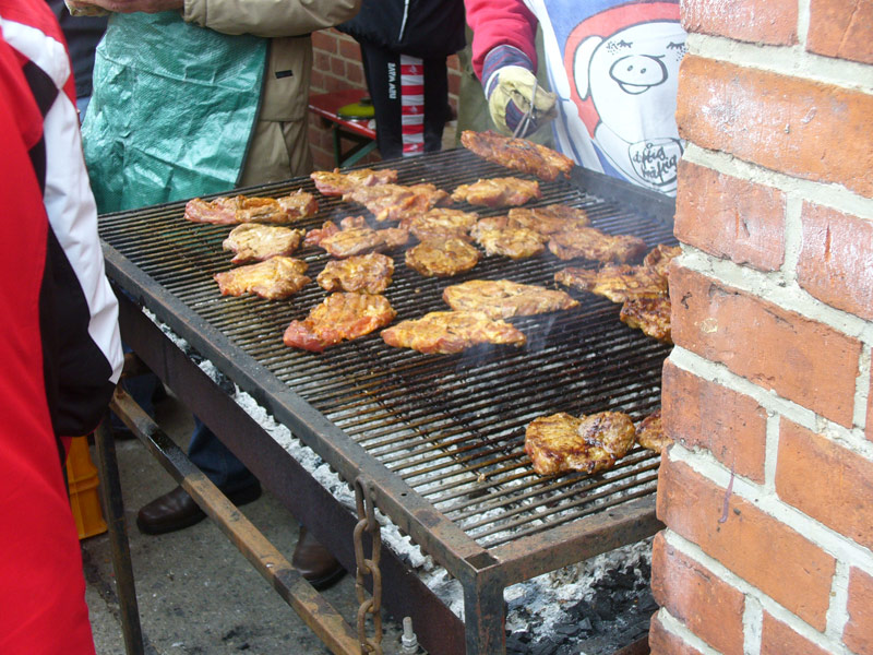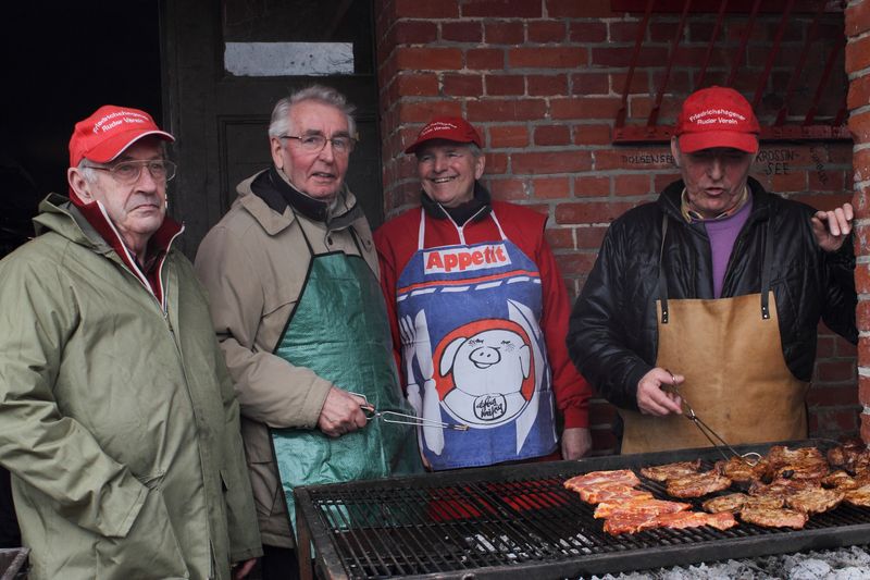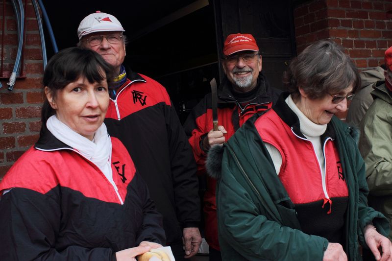 Die Biere flossen aus allem Rohren in die Kehlen, doch unwiderstehlich war auch die Fülle und Qualität der etwa 50 Kuchen, selbst gebacken von der bewährten Brigade der FRV-Damen, mit Prima-Kaffee. Schnell stieg der Stimmungspegel, draußen angeheizt von Wackis ohren- und sinnebetäubender Beschallung, auch Musik genannt. Bald füllten auch unzählige Würste und Steaks die Mägen, präsentiert von unseren Fleißigen an den Abfutter-Ständen.