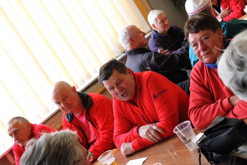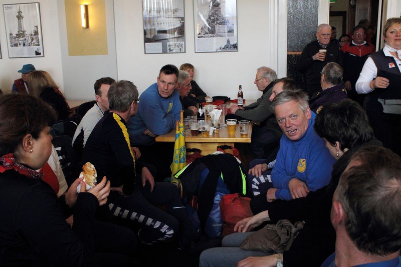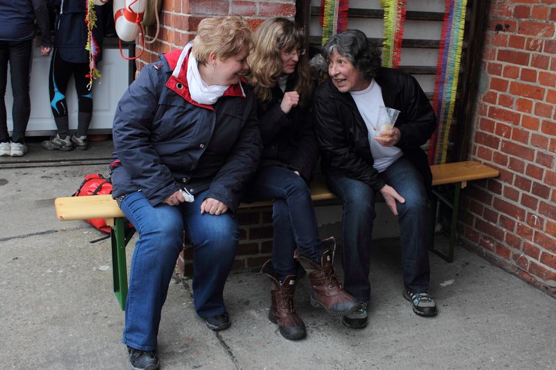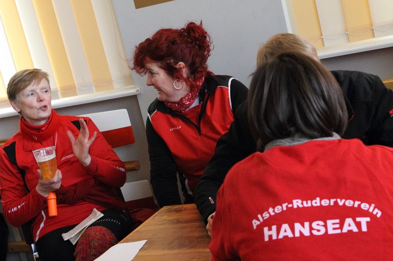 Obwohl noch schwach durch wochenlange Krankheit, fühlte ich mich wie ein Faulpels diesmal. Ich kam um 16 Uhr und fand noch ein einsames, aber leckeres Stück Käsekuchen, dazu schön starken Kaffee. Meine nette Begleitung, Schwesterlein (hat früher auch mal bei uns gerudert) mit trinkfestem Mann, seit x Jahren nicht mehr zum Anrudern gekommen, erlitten einen gelinden Schock über das lärmende Geschehen. Ich erhielt gleich einen mahnenden Zuruf aus der Frauen-Gruppe: "Mittwoch Rudern!"